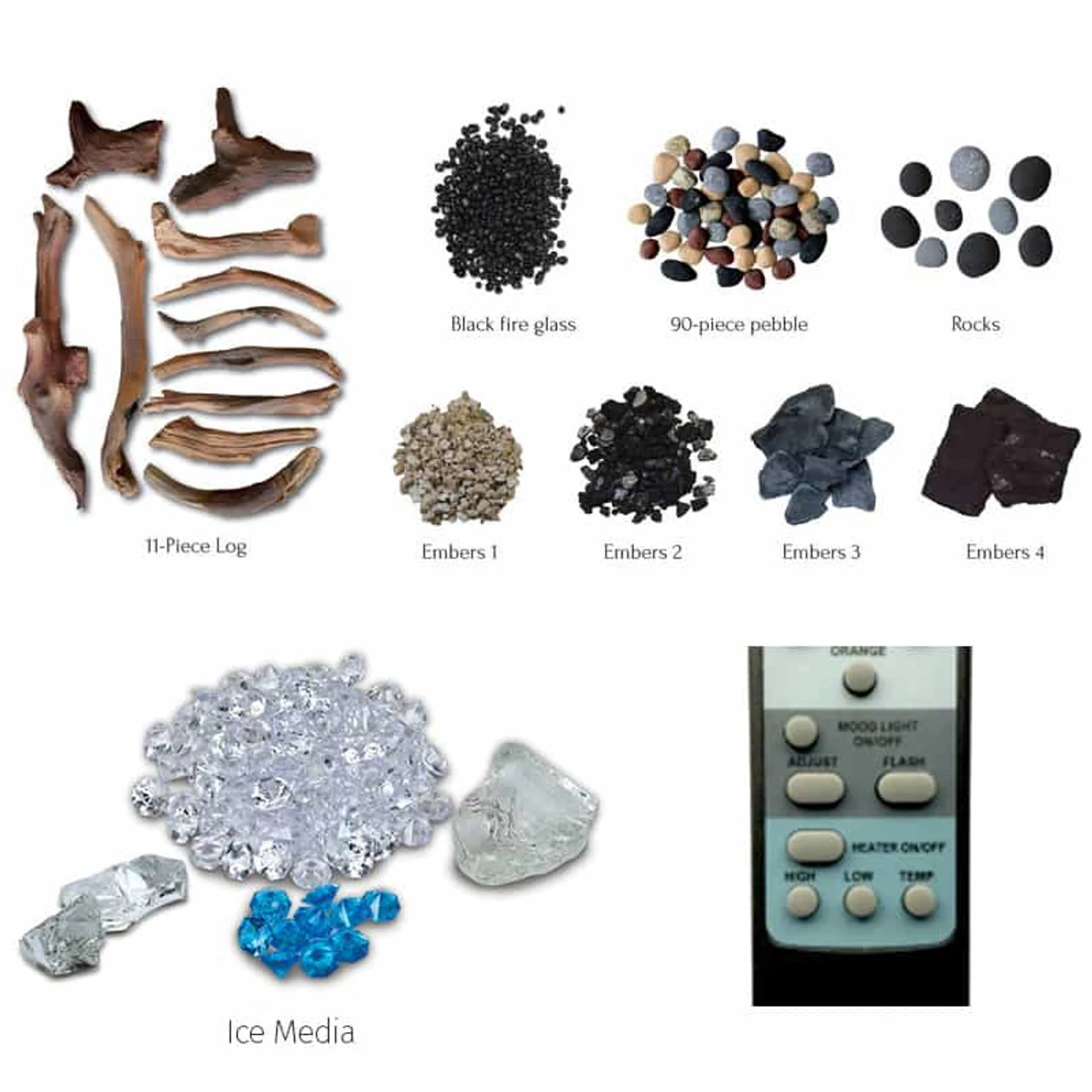 14-1/4” deep comes Drift 15 piece logset with deluxe media: black fire glass, pebbles, stones and vermiculite ashes and the ICE media set..