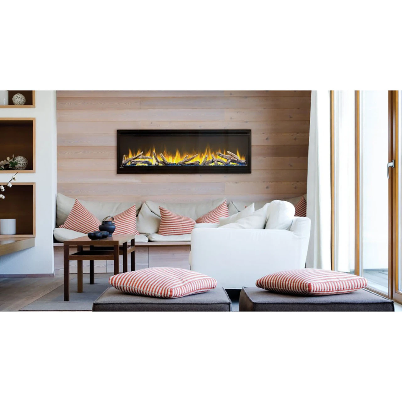 Napoleon’s Alluravision™ Deep Depth linear electric fireplace allows you to see the fireplace and not the frame with its nearly frameless linear design. As a contemporary electric fireplace, the frameless modern look is just as important as its functionality. Easy to use, the plug and play installation allows this unit to be hung on the wall and turned on immediately. The Alluravision™ can also be hardwired in to hide plugs. Select from four flame colors, yellow, orange, blue, and multi-colored and with five different flame speeds, further ensure the perfect atmosphere for any space. Illuminate the firebox without flame using the NIGHT LIGHT™ to boost ambient light and create a warm glow. Add the driftwood logs for increased hearth-like elegance. Enjoy the Alluravision™ all year round with separate flame and heat controls.