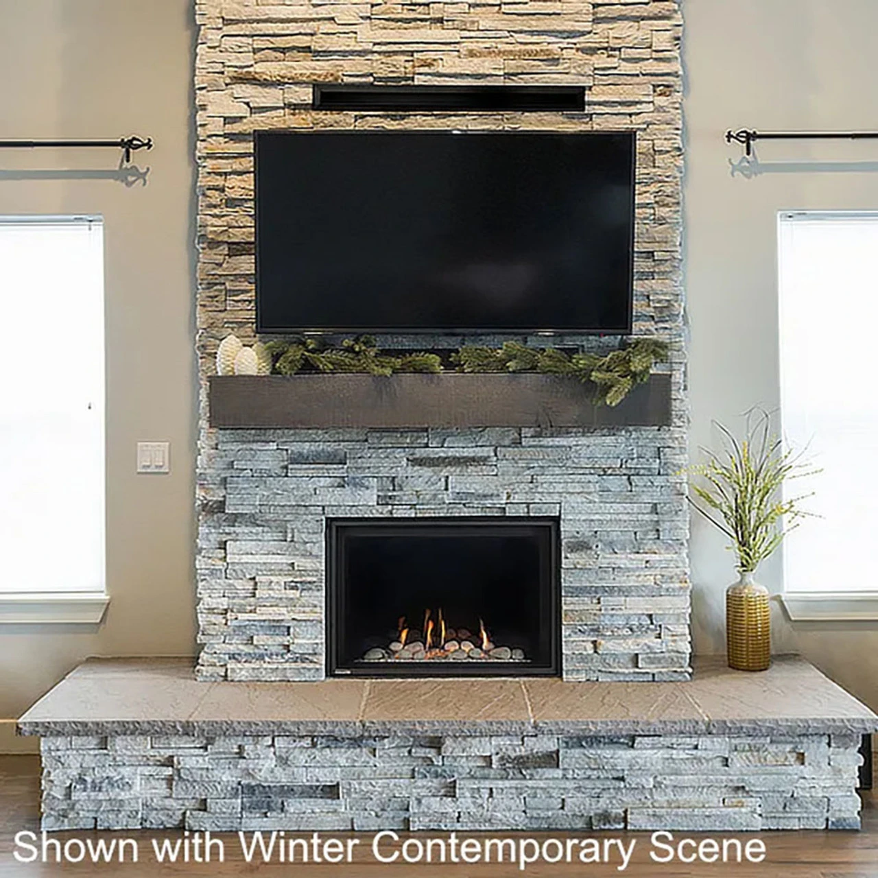 Introducing the full load DELRAY Square DRSQ38. This Flexible gas fireplace features sleek contemporary styling and a small footprint that’s perfect for new construction and retrofit installations at minimal impact to floor space. The DELRAY Square is a high efficiency, mobile home compatible fireplace that is ready to customize with any of our stunning logsets or contemporary scenes. Combustible wood facing can be installed right down to the glass opening.