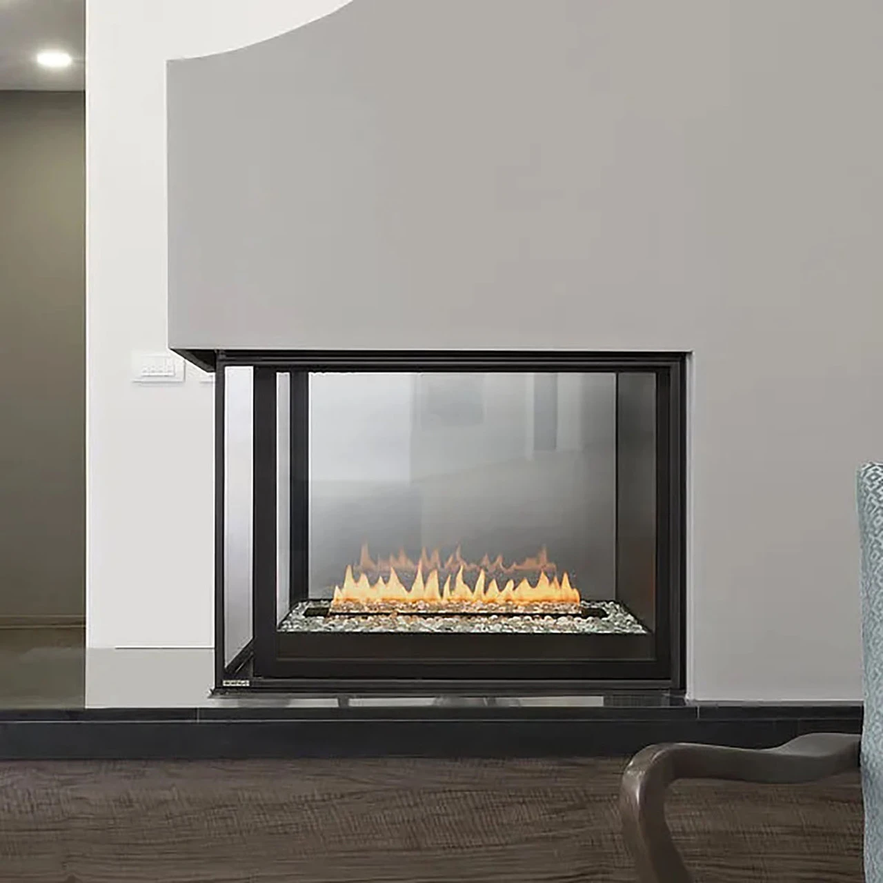 The Pier – a dimensional flame experience. The Divine Pier is a multi-sided direct vent fireplace characterized by a unique three window viewing area. Rock or tile can be installed over the firebox frame for a clean finish look.