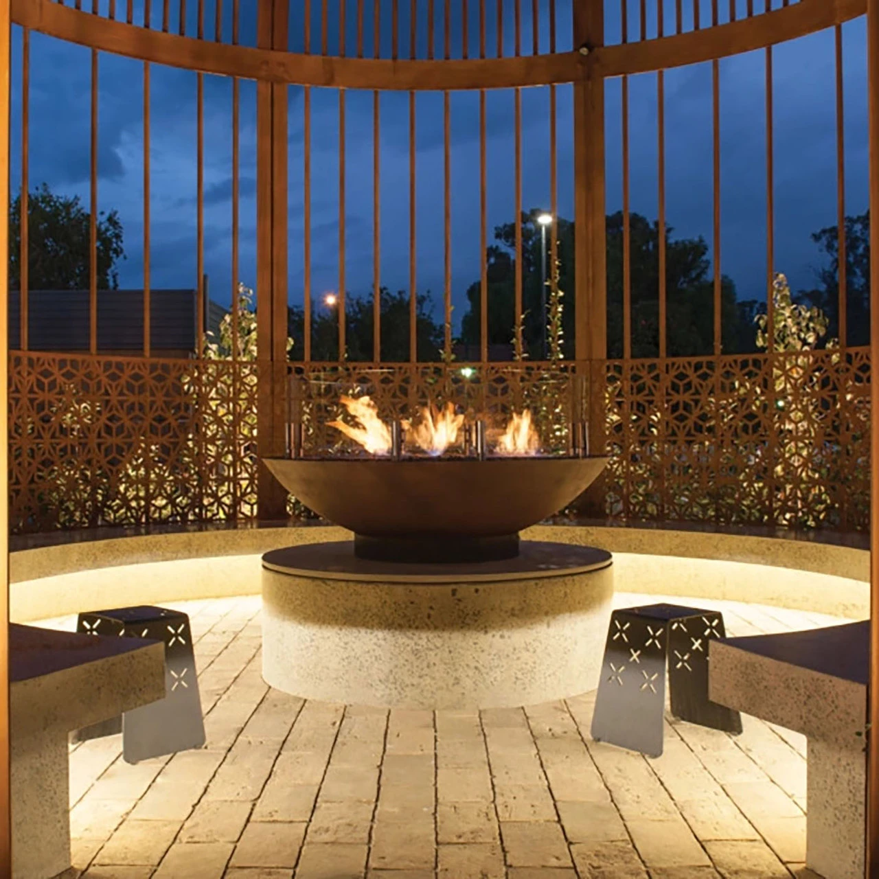 Diverse range of materials can be used in your bespoke fire – think concrete and hard timber benches, marble recesses, stacked stone walls, stainless steel – even metal barrels cut in half!