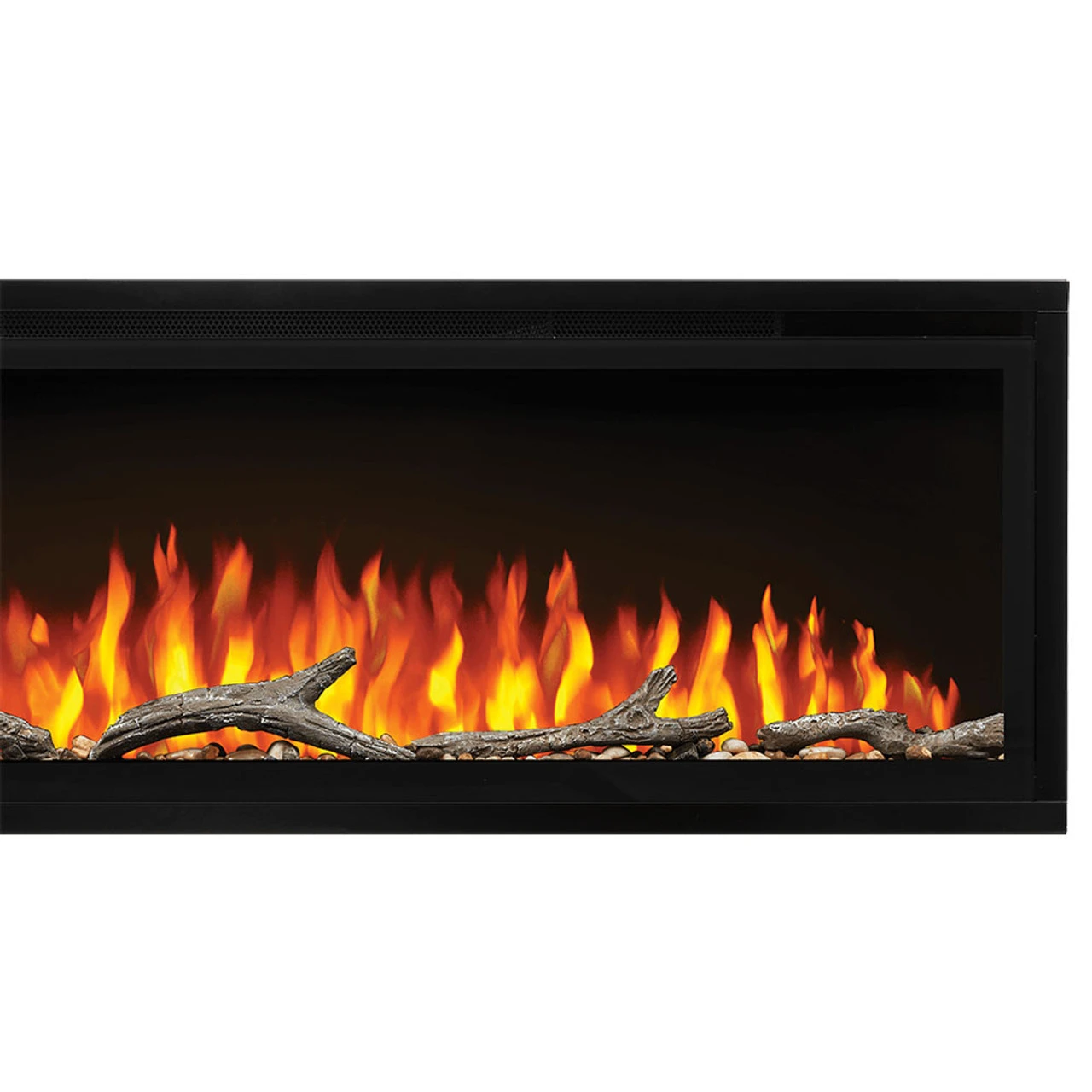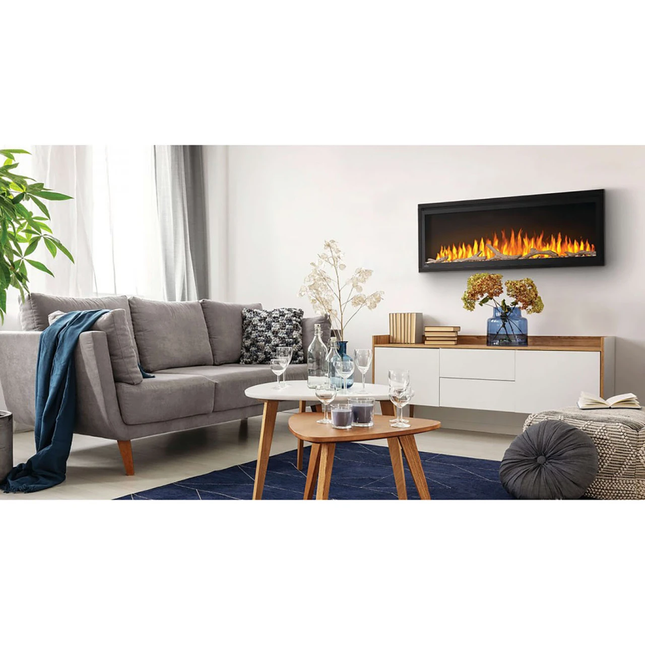 Make a statement with the Napoleon Enticeâ„¢ 50 Electric Fireplace. This fireplace puts out an incredible amount of heat, glittering with multicolored flames and a crystal ember bed. You don’t need a specialist or a gas fitter for this expansive beauty, just hang on the wall and plug in for instant transformation of your space. Traditional orange flames, or cool blue flames, or a combination of the two will set the mood. The shallow depth means that this fireplace doesn’t intrude into your living space, but simply accents it with the expansive view of the fire. Place this electric fireplace anywhere you want to make a huge impact, perfectly suited for either your home or a commercial setting.