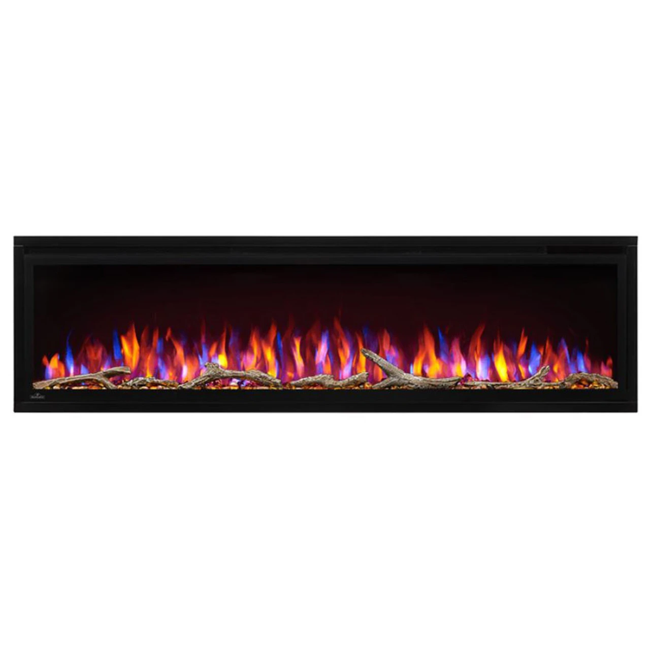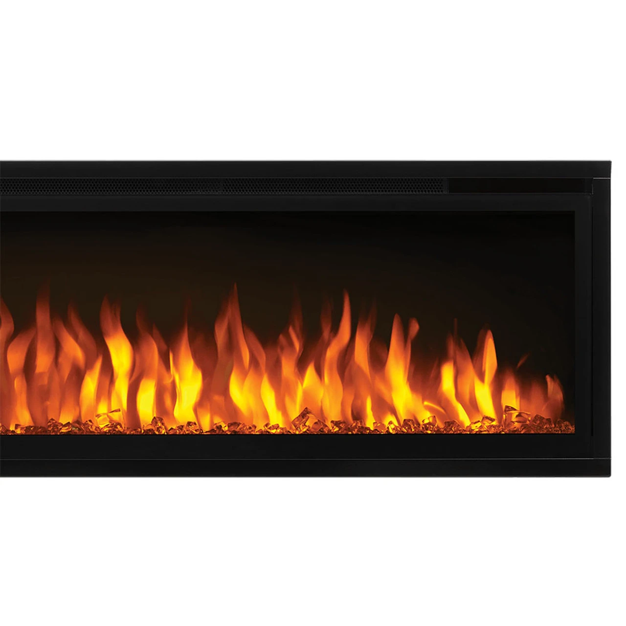 Make a statement with the Napoleon Enticeâ„¢ 60 Electric Fireplace. This fireplace puts out an incredible amount of heat, glittering with multicolored flames and a crystal ember bed. You don’t need a specialist or a gas fitter for this expansive beauty, just hang on the wall and plug in for instant transformation of your space. Traditional orange flames, or cool blue flames, or a combination of the two will set the mood. The shallow depth means that this fireplace doesn’t intrude into your living space, but simply accents it with the expansive view of the fire. Place this electric fireplace anywhere you want to make a huge impact, perfectly suited for either your home or a commercial setting.
