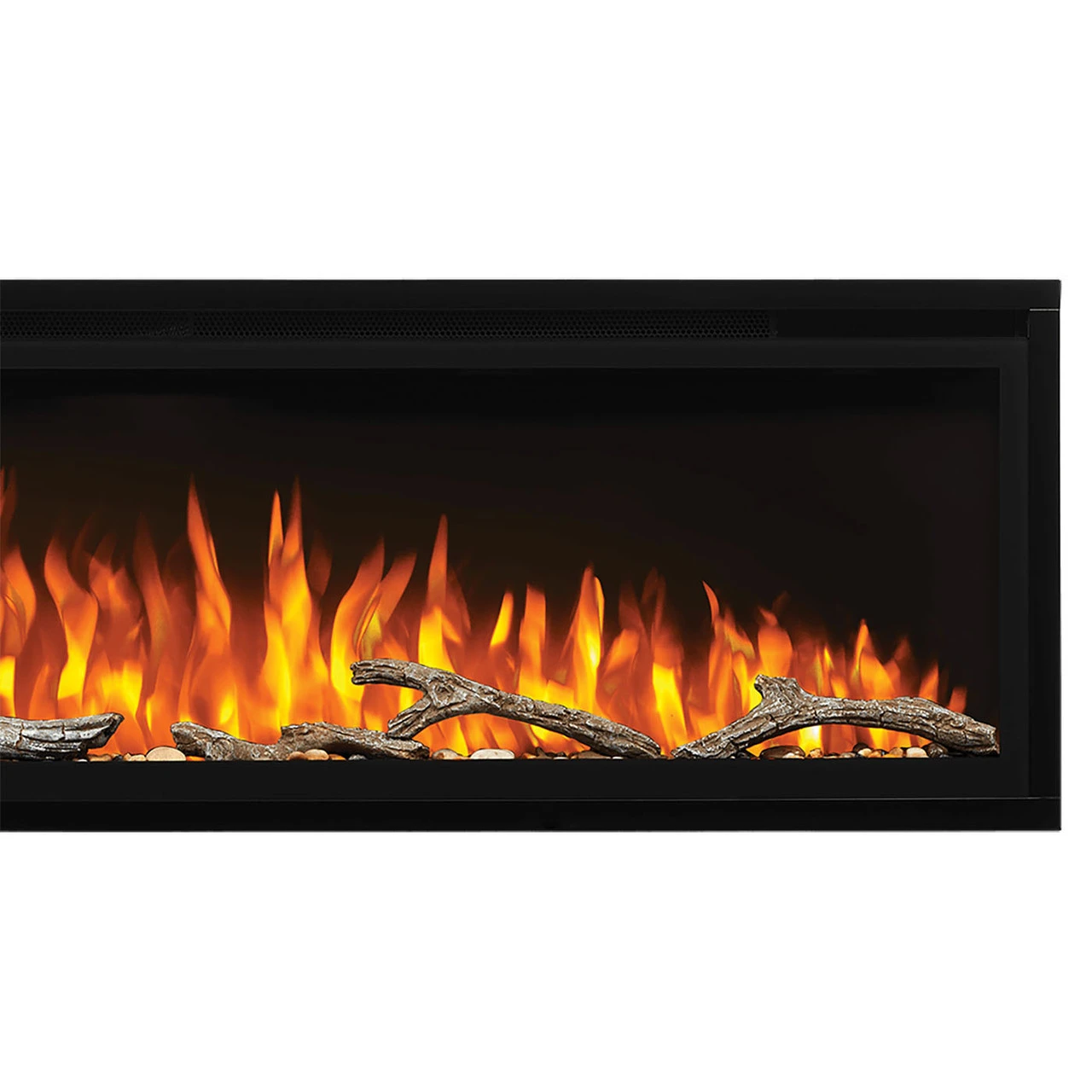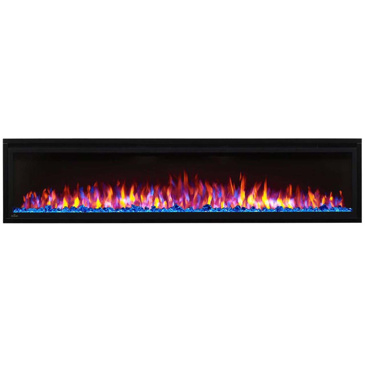 Make a statement with the Napoleon Entice™ 72 Electric Fireplace. This fireplace puts out an incredible amount of heat, glittering with multicolored flames and a crystal ember bed. You don’t need a specialist or a gas fitter for this expansive beauty, just hang on the wall and plug in for instant transformation of your space. Traditional orange flames, or cool blue flames, or a combination of the two will set the mood. The shallow depth means that this fireplace doesn’t intrude into your living space, but simply accents it with the expansive view of the fire. Place this electric fireplace anywhere you want to make a huge impact, perfectly suited for either your home or a commercial setting.