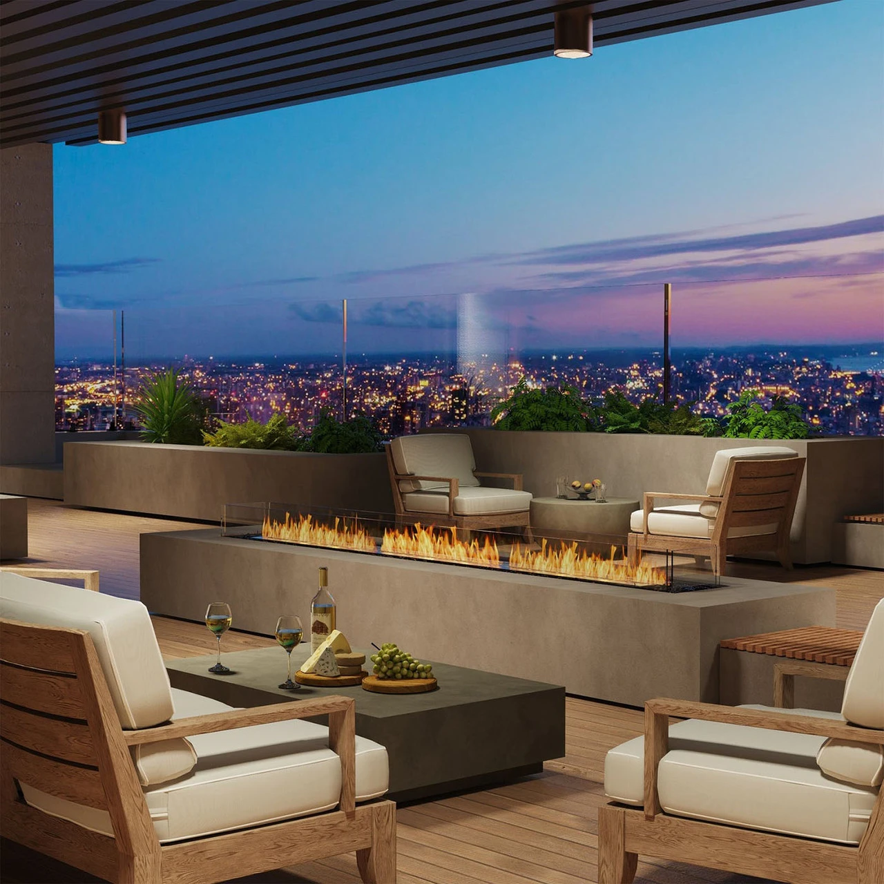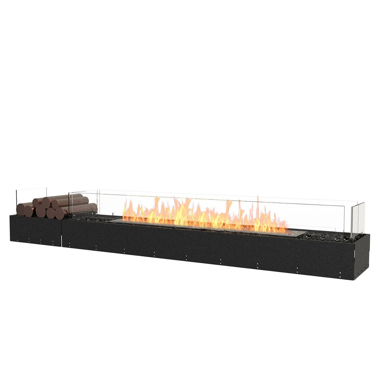 At the center of the Bench is a stainless steel burner that utilizes e-NRG Bioethanol Fuel (sold separately) for a clean and soot-free burn. Accent the area around the burner with the included black glass charcoal for a timeless, stylish flair. Its zero-clearance construction–designed to be installed into a framework secured to the floor–features a zinc sealed steel construction finished with a black powder coat to prevent rusting. A toughened glass windscreen, surrounding the burner, protects the flames from the wind and offers an additional layer of comfort and safety–for peace of mind. This model is offered in a variety of configurations, so that you can select the option that best suits your desired look and needs. The optional decorative box adds a cubby space for adorning with non-combustible logs (sold separately).