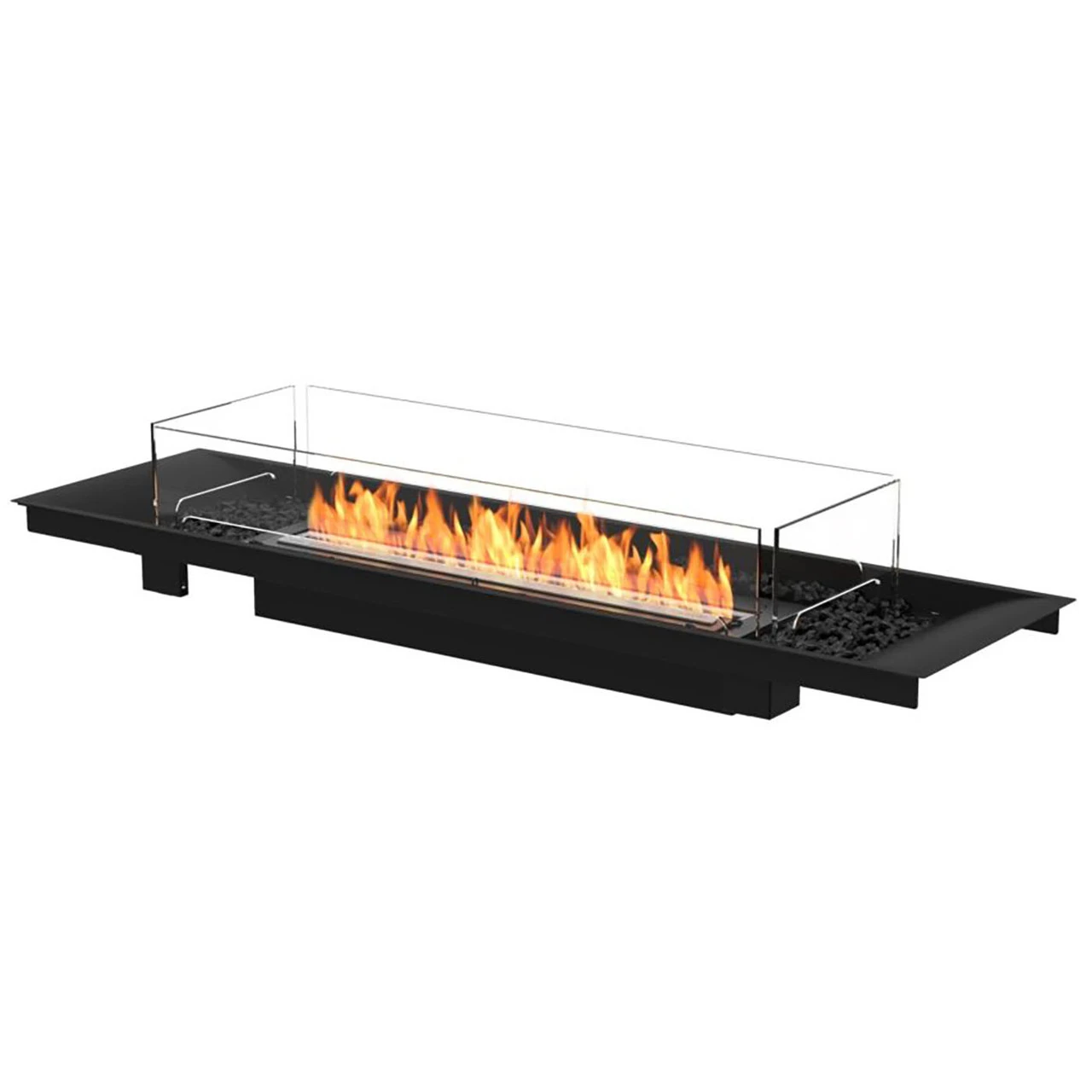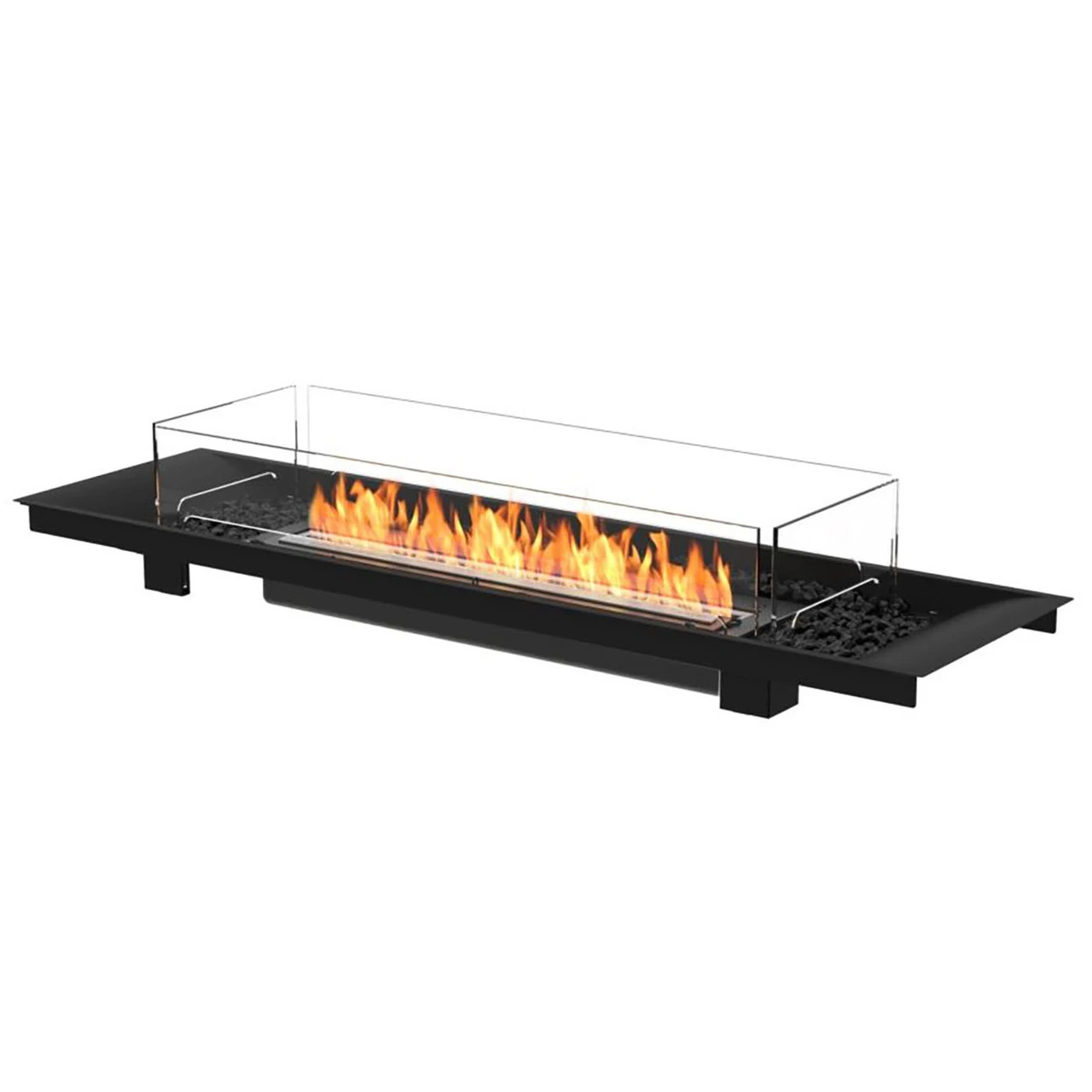 A clean linear design and black glass charcoal softened by the curve of the metal tray at each end, combined with golden flickering flames create a stylish yet warm and organic look.