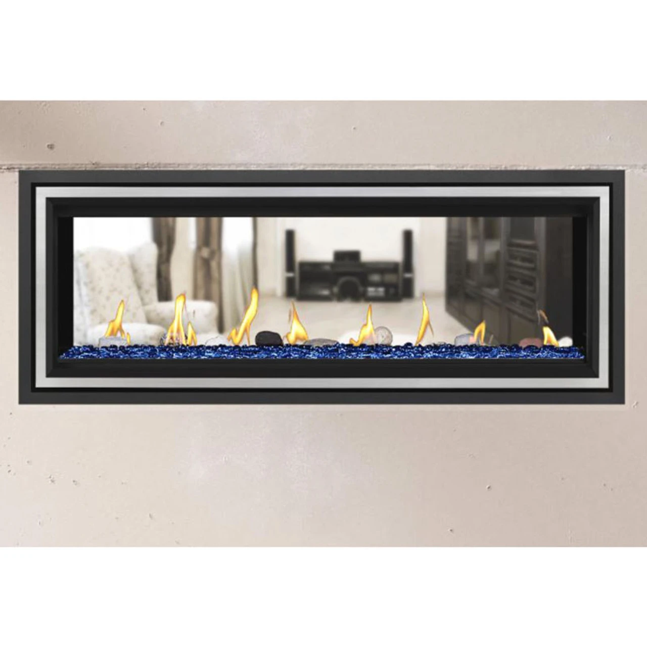 Napoleon’s Vector™ 50 See Through linear gas fireplace features a sleek, contemporary design and multitudes of designer options. Complete two spaces with a luxurious fireplace, including the Divinity™ flame pattern with heightened peaks and valleys. Enjoy the flames’ radiant glow, shining through the clear glass bead ember bed. Use the NIGHT LIGHT™ system and the multi-colored LED lights beneath the ember bed that accent from underneath to add a gentle glow to the room when not using the fire. Premium media kits, like modern Nickel Stix, the natural Mineral Rock Kit, beachy Shore, and Beach Fire Media Kits, and multicolored Glass Ember Media or Glass Beads to create a truly custom look. You can relax while relishing the glow because you can control the Vector™ from your favorite mobile device with our convenient eFire app.